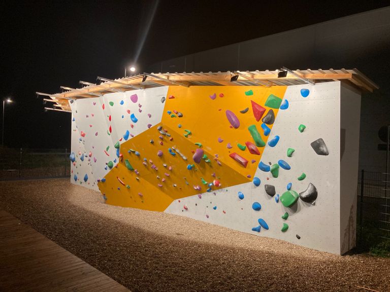 Die Beleuchtung der neuen Boulderwand im Außenbereich der Kletterhalle Blocbuster in Bielefeld wurde erfolgreich fertiggestellt.